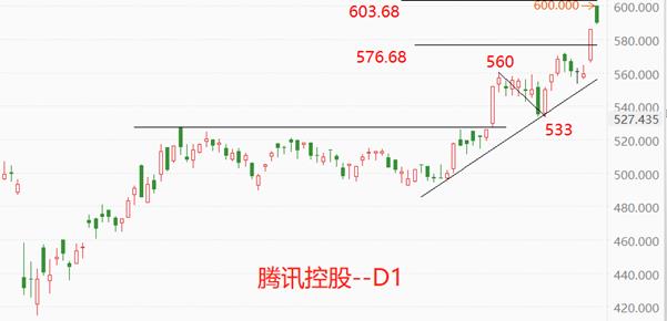 From the trend structure perspective, Tencent Holdings' daily stock price is in a medium- and long-term bullish trend, the weekly level rise is more obvious, and the momentum is stronger. It is expected that this state can last for a long time. The latest band is up, with a high of HK$600. This price is an integer mark, and the short-term market may encounter obstacles. From the perspective of golden section, 576.68 is the 0.618 quarter of the previous round of decline. After a slight recurrence of the market, it successfully broke upward. 603.68 points are at 1.618 percentile. After the market breaks through HK$600, it will encounter obstacles at this price, and the probability of falling back is relatively high. Considering that the Shanghai www.xm-forex.composite Index currently performs strongly and closes positive lines for eight consecutive trading days, the market sentiment is relatively optimistic. Tencent Holdings takes advantage of optimism and the probability of its stock price breaking through the resistance level is high.