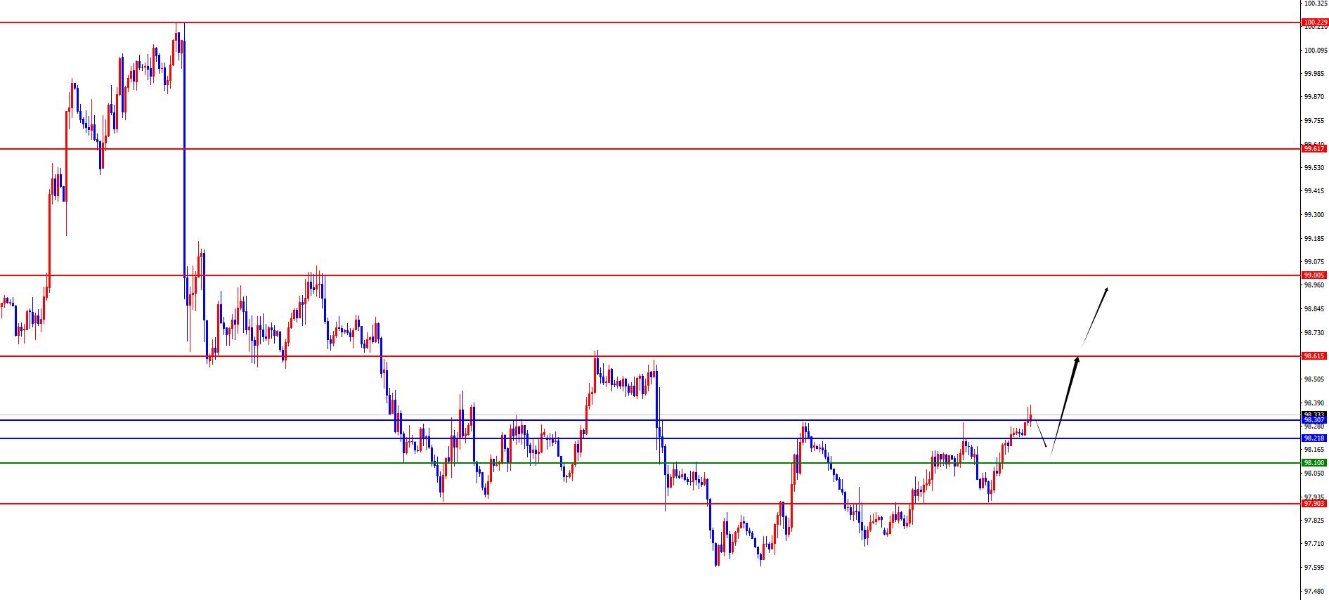 From a multi-cycle analysis, the weekly level has recently been supported by the weekly support up and down. This week, the focus is on the 98.30 position to stabilize. Once it stands firm, the medium-term bulls will continue to rise. At the daily level, last week, the price suppressed the daily resistance position and continued to fluctuate below the daily resistance position. Currently, the daily resistance is at 98.20. The price is more www.xm-forex.commonly treated with the band above this position. From the four-hour perspective, the four-hour perspective is the key to our emphasis on short-term price trends. After the price rose on Monday, it continued to rise based on the four-hour support yesterday. Currently, the four-hour support is in the 98.10 area, and the price is more treated above this position. Based on the multi-cycle view, the price will continue to pay attention to the upward trend in the range of 98.10-30, and the subsequent focus will be on further continuation of bulls.