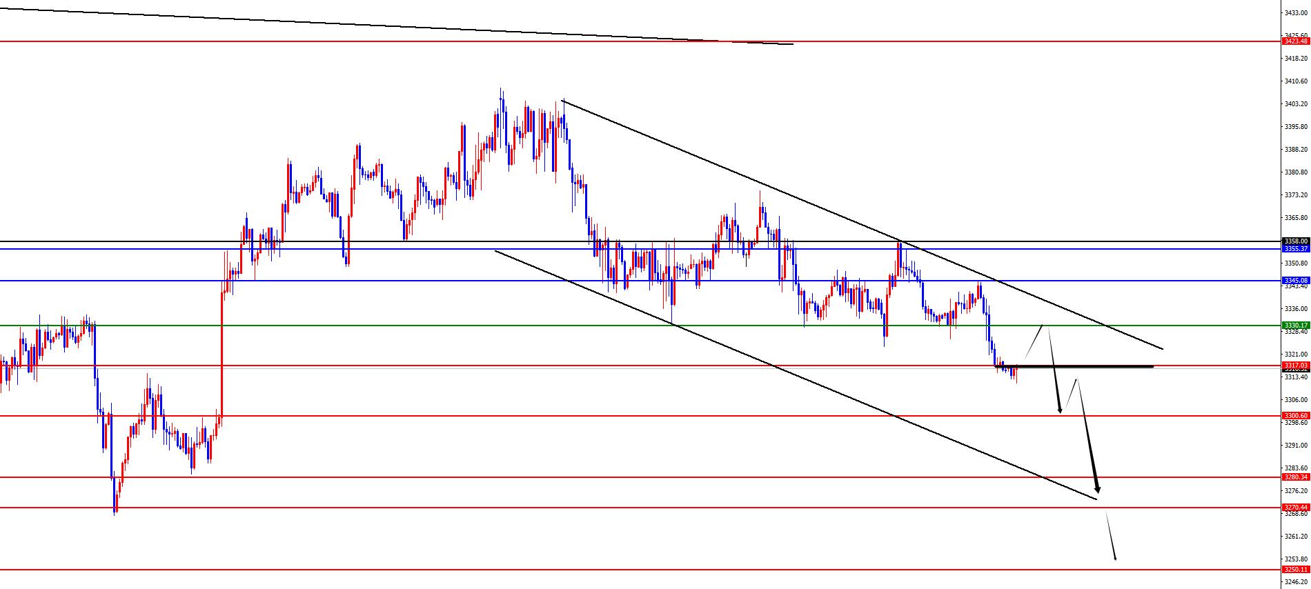 From multi-cycle analysis, first observe the monthly line rhythm. The price will run at the rhythm in May as the author said, and the final cross state. The final price in June is still in an anti-K state. For the current need to pay attention to the gains and losses of the monthly line high and low points, the price will continue to be under pressure after the price breaks the monthly line low point. From the weekly level, the price on the weekly line has been fluctuating in two negative and two positive recent times. Last week was the first week of decline, and this week continues to pay attention to pressure. The weekly long-short watershed position is at 3345. From the daily level, the current daily resistance is at 3355, and the overall daily line is currently bearish, so it continues to be laid out at high altitudes. Four hours is the key to the short-term trend. In the past two days, the price has pierced the four-hour resistance and then under pressure. The time point begins to bear pressure in the European session, so we will pay attention to the European session time point in the future. At the same time, the current four-hour resistance is around 3330. We will pay attention to the pressure in this area in the future. The price in the first hour is down from the previous day's low point again in the morning session. The current rebound is focused on the early trading high point. Once the price breaks through, it will continue to pay attention to the pressure near the four-hour resistance. The time point will be timely to continue to pay attention to the European session period, focusing on the weak pressure in the US session, and pay attention to the 3310-3290-3280-3250 area below.