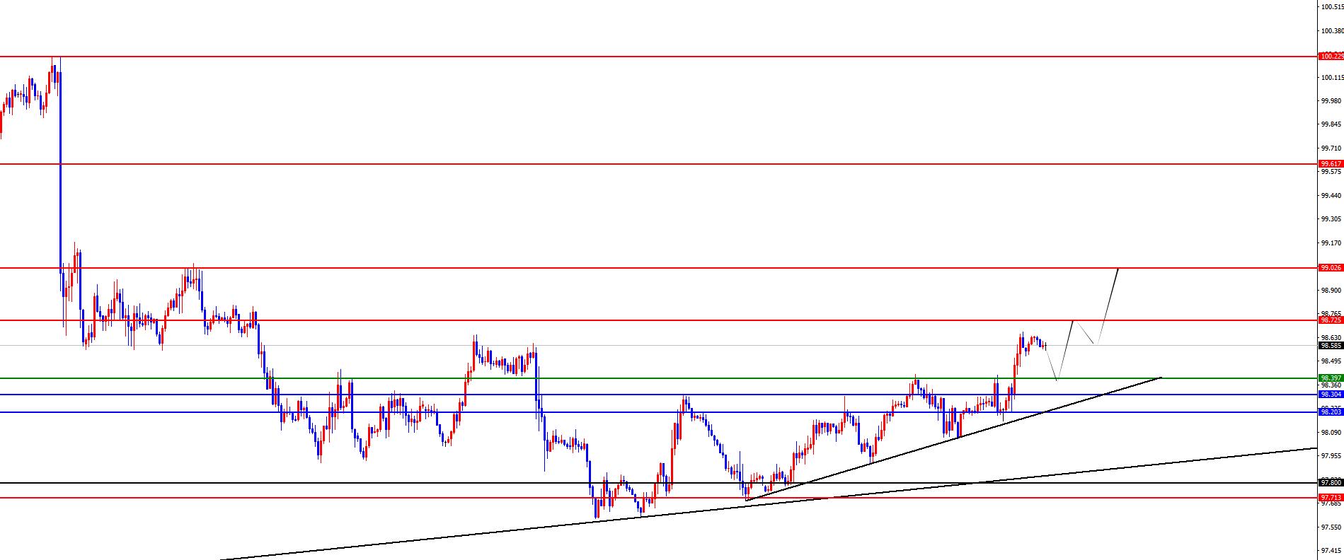 From a multi-cycle analysis, the weekly level has recently been supported by the weekly support up and down. This week, the focus is on the 98.30 position to stabilize. Once it stands firm, the medium-term bulls will continue to rise. At the daily level, last week, the price suppressed the daily resistance position and continued to fluctuate below the daily resistance position. The current daily resistance is at 98.20. The price broke through upwardly yesterday and stood firm. In the future, we will pay attention to the market for bulls to pull up in the band. From the four-hour perspective, the four-hour perspective is the key to our emphasis on short-term price trends. Currently, the four-hour support range is 98.30-40, so overall, you can continue to look upward based on this area. From an hour perspective, yesterday's price rose as the author said based on the trend line and four-hour support. You can pay attention to further and continue in the future. The short-term above focuses on the 98.70-99 area.