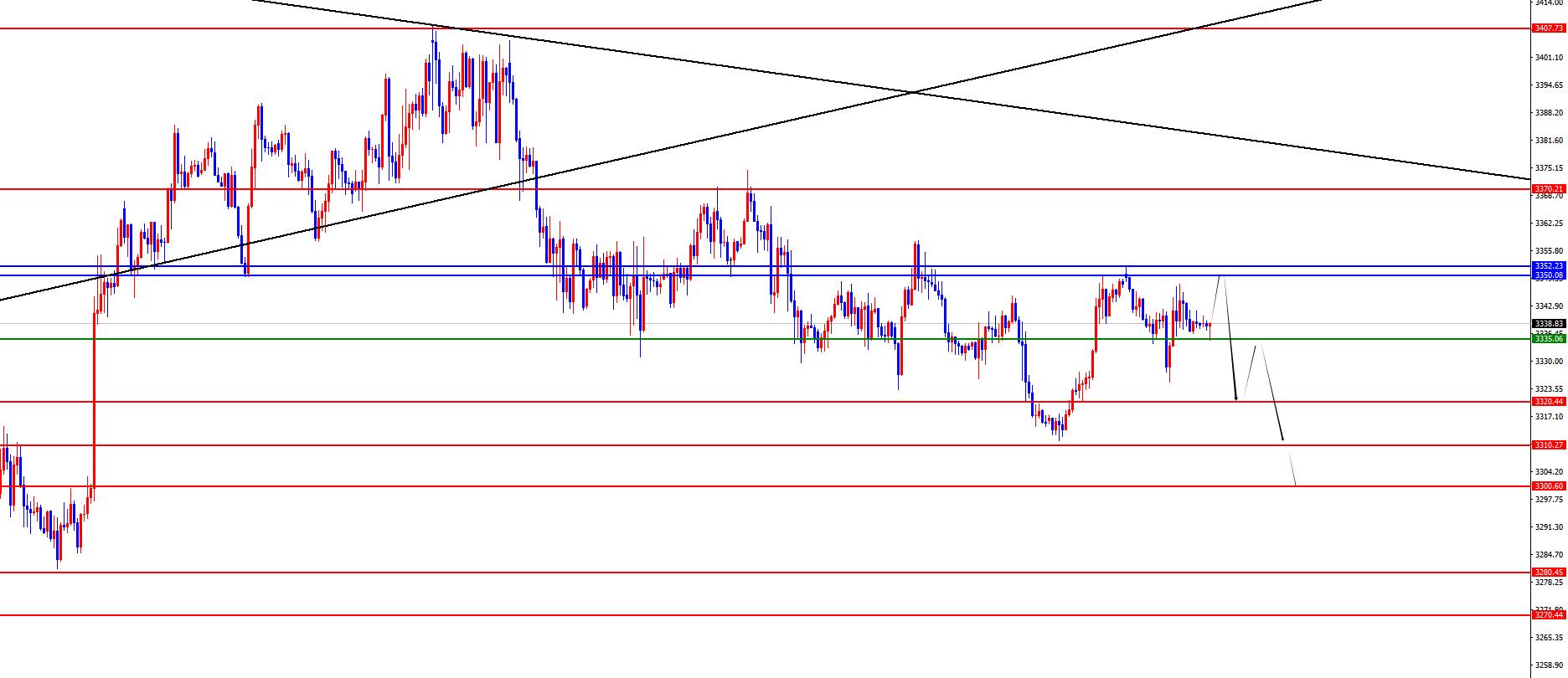 Gold, on ThursdayThe price of gold generally showed a downward trend, with the highest price rising to 3352.05 on the day, falling to 3325.06 on the lowest price, closing at 3338.43 on the day. In response to the short-term rise and fall of gold during the early trading session on Thursday, the price continued to be weak and pierced the four-hour support before the US session. It then rose again but did not break through the early trading high point. It was under pressure during the overnight fluctuation and finally the daily line ended with a big negative. Currently, gold continues to be under pressure before breaking through weekly and daily resistance, and subsequent declines below four-hour support will accelerate.