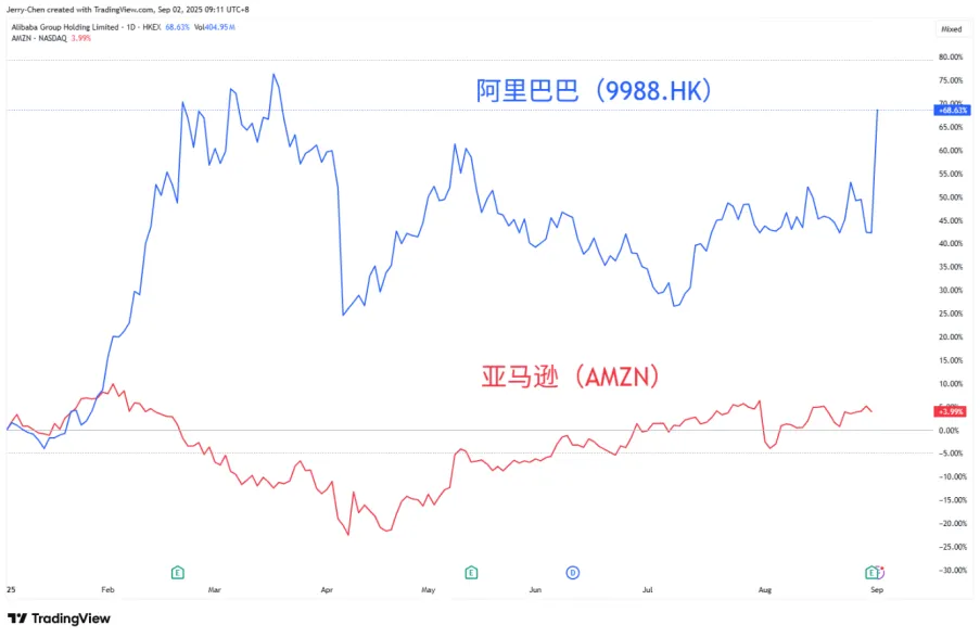 U.S. stock markets closed on Monday due to the Labor Day holiday, with major European indexes generally rising. Driven by positive news from Alibaba (+18.5%), the Hang Seng Index jumped 2.1% on Monday. The following figure shows the www.xm-forex.comparison of Alibaba and Amazon's growth this year.