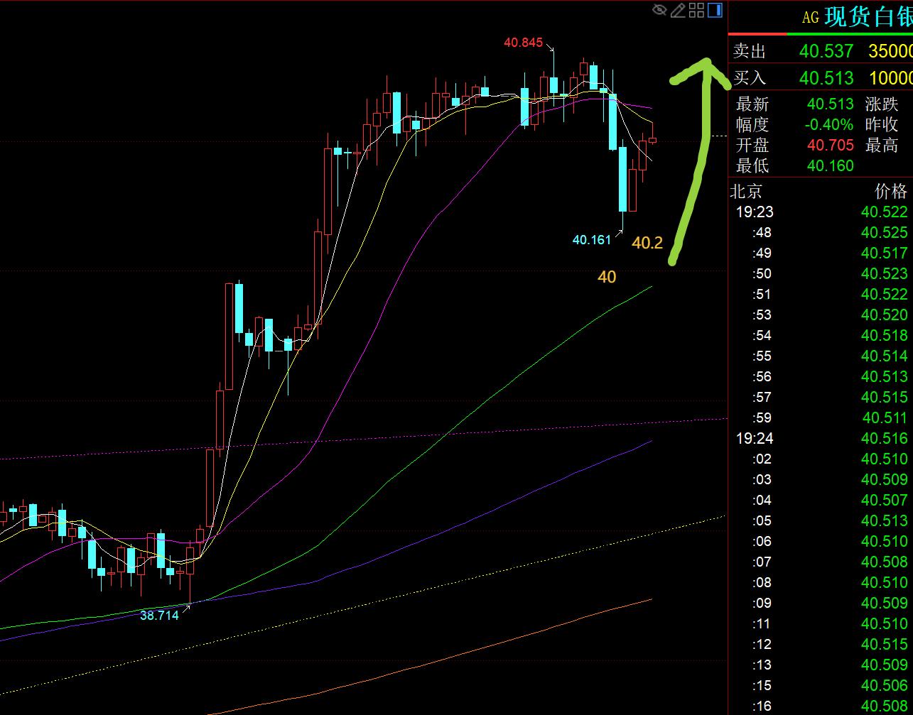 Second, silver: the weekend video gave a back-retracement of 39.5 and 39.35 in advance, and can continue to be bullish. Yesterday morning, it fell to 39.5 and stabilized, and it attacked 1 unilaterally to the 40.6 line, and directly won 1 yuan a day, which is equivalent to a rise of 50 US dollars in gold;