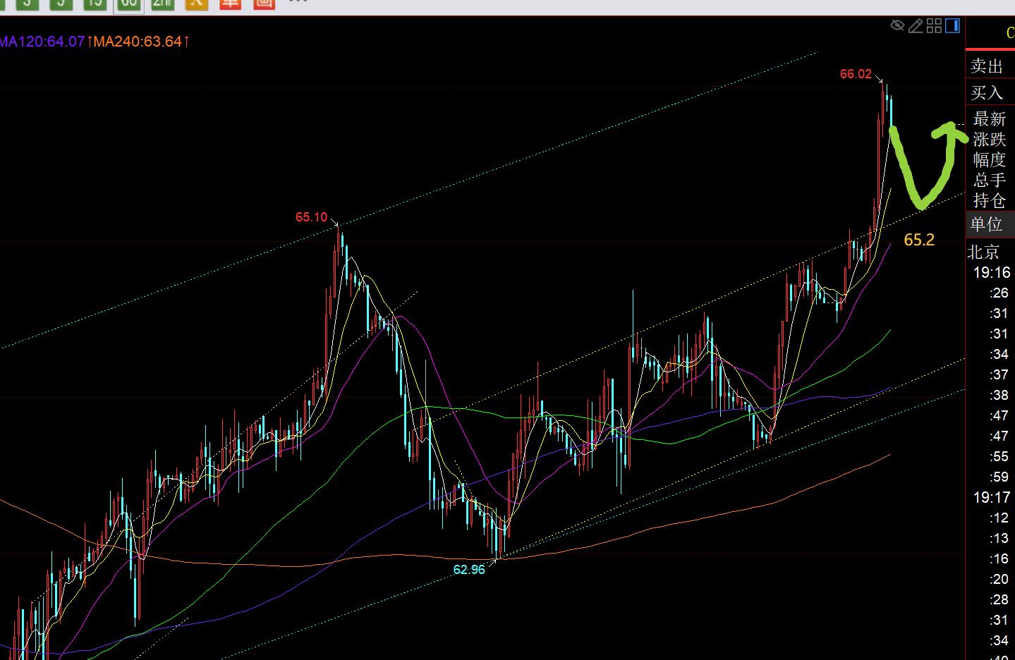 In terms of crude oil: the daily line closed positively yesterday and broke through the middle track first, which tends to continue to rebound upward; today's European session continued to break the highs, and the US session looked at the second pull-up, pay attention to the yellow channel retracement confirming support of 65.2, stabilizing and bullish;