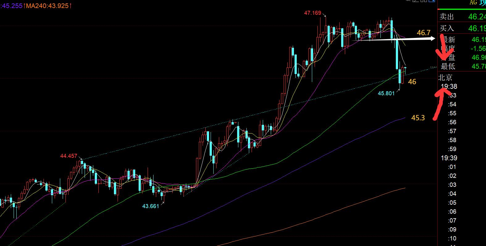 Silver: From the daily level, it also maintains a strong one-sided movement, and the continuous positive and single negative movements are reflected in full swing; therefore, although it falls back in the day, as long as it stabilizes above the 5 moving average, it is still easy to continue to attack; only by losing the 5 moving average can you adjust to the 10 moving average and then stabilize and exert force; from the short-term perspective in the chart, the European session is also suppressing a wave of breaking the bottom. Like gold, the US rebounds before and after, and there may be a second downward move, pay attention to the middle track 46.7, first rebound and touch, you can try to see a short-term decline; support 46, 45.5-45.3, if the US market still cannot suppress twice before 22 points and there is a stabilization K, you can first rebound to confirm the mid-line 46.7; break through to 46.7, and then return to the strong pattern to set a new high, otherwise it will be a temporary oscillation;