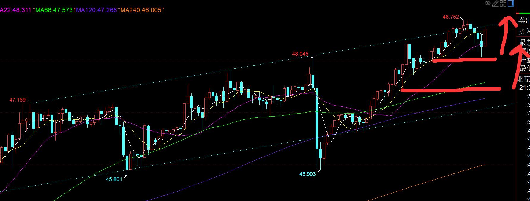 segundo, Silver: dos tocando en la mañana el viernes pasado, larga sombra, la sombra K, las cuales fueron retractas para confirmar la vía inferior del canal amarillo en el canal amarillo en la tabla estabilizada, y se rompió a través de la línea de una hora en la tarde y se creía nuevamente que se creía que la disminución de la noche en la tabla se estabilizó y retrocedió. therefore, 47.15 directly followed the bullish, and the US reached the 47.7 target before the market, and then the US continued to pull up and approached the upper track of the channel 48.36 line, a big V was very strong, which also indicates that silver is still in a strong stage in the short term;