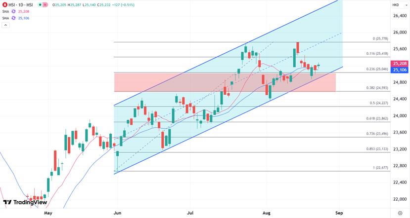 恒指自上周以来呈现回落的趋势,部分跟随外围的观望情绪,近几日窄幅交投在日图均线范围,当前周线暂时录得轻微跌幅,日内收盘是否高于该位成为下周能否打破沉默的关键,如果重启反弹,会以25400至25800范围为目标,尤其是弥补8月中旬缺口的情况下。但如果跌破均线,则关注上行通道底部有望捍卫25000关口。