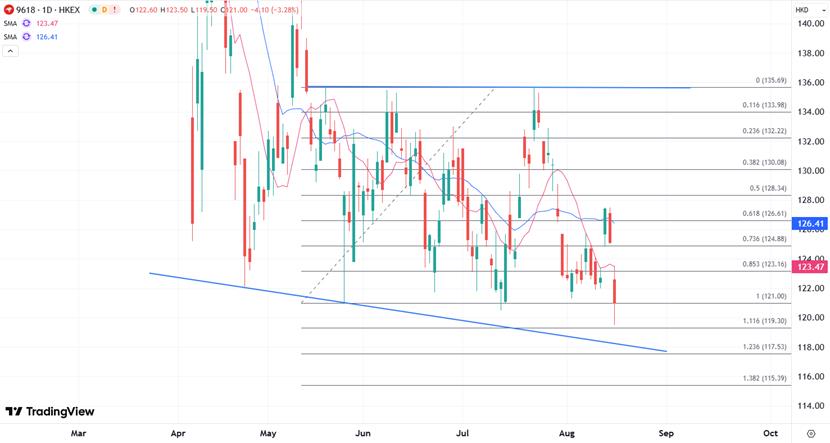 O preço das ações da JD.com se abriu mais baixo e fechou mais baixo após o desempenho. Além do arrasto do desempenho mais recente, ele foi parcialmente seguido pela pressão descendente do mercado. O preço das ações atingiu o mais baixo desde setembro do ano passado. Tecnicamente, a média móvel de 10 dias se tornou uma alta intradia. Prestar atenção ao fundo de HK $ 120 é a meta. Se cair abaixo, mais pedidos de venda podem seguir, mas prestar atenção à linha de tendência de baixo nível pode fornecer algum suporte.