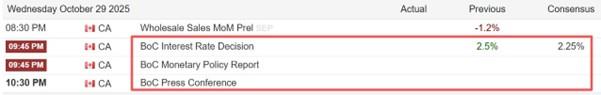 Às 21h45 desta quarta-feira, o Banco do Canadá anunciará os resultados de sua resolução de taxas de juros de outubro. As principais expectativas são de que reduzirá as taxas de juro em 25 pontos base. O desenvolvimento económico do Canadá depende fortemente dos Estados Unidos. Desde o início deste ano, o Presidente dos EUA, Trump, continuou a aumentar as tarifas sobre produtos importados do Canadá, agravando a recessão macroeconómica nos próprios Estados Unidos.Há sinais de que as perspectivas de crescimento da economia canadiana são extremamente pessimistas. No sábado passado, Trump declarou nas redes sociais que imporia uma tarifa adicional de 10% ao Canadá em retaliação aos seus anúncios que criticavam as políticas tarifárias dos EUA. Isto irá enfraquecer seriamente a confiança dos participantes no mercado na detenção do dólar canadiano.