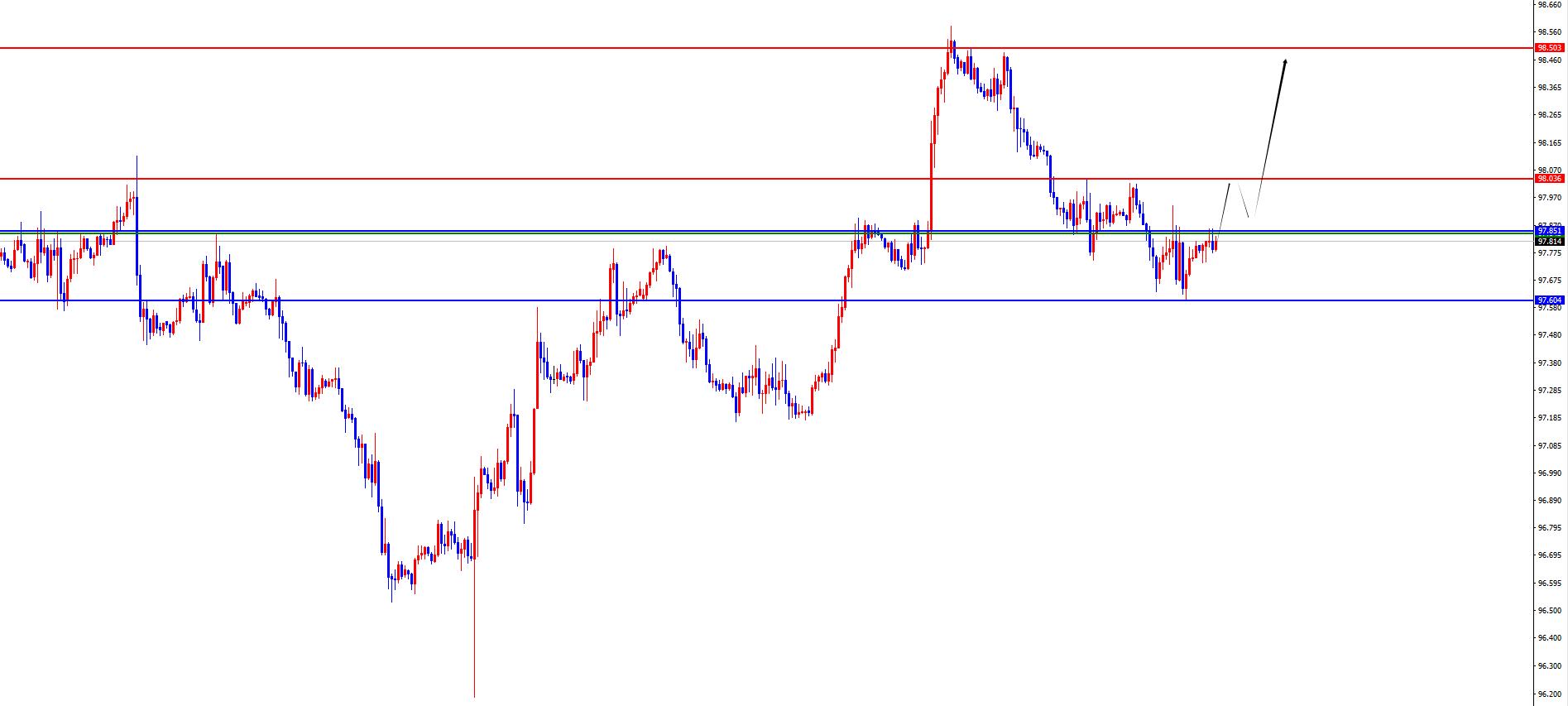 從多周期分析,週線級別來看近期價格在周線關鍵上下盤整,目前週線支撐於97.85區域,同時在上週價格站上週線阻力,後續看中期看多頭延續。從日線級別看,隨著時間的推移目前日線支撐於97.60區域,價格此位置之上波段進一步上漲。從四小時上看,目前看四小時阻力於97.60位置,昨日強調關註四小時分水嶺能否站穩,隨著時間的推移今日持續關註四小時站穩表現,站穩後繼續看延續。