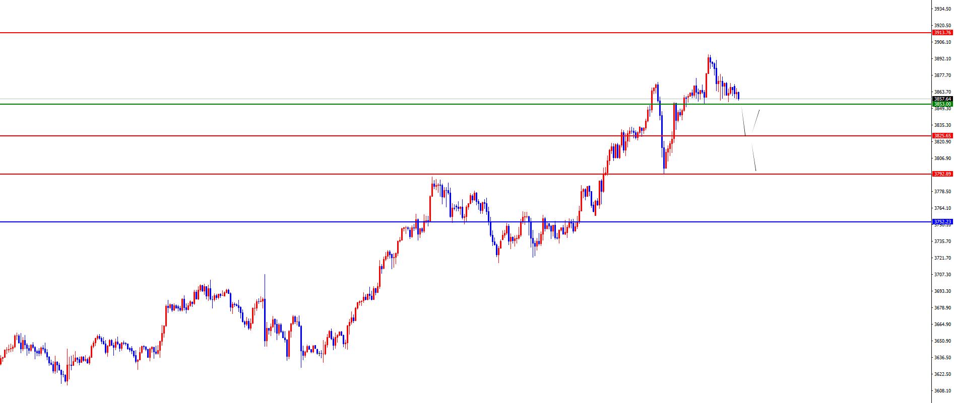 從多周期分析,首先觀察月線節奏,從長線上看3130位置是長線走勢的分水嶺,價格在此位置之上長線多對待即可。從周線級別看,目前週線多空分水嶺於3490位置,價格在此位置之上中線多對待即可。從日線級別看,暫時需要關注3752區域支撐,此位置之上波段多對待,目前繼續右側交易方式對待。從四小時上看,觀察黃金上漲節奏中,近期上漲價格拉升170點左右後出現承壓,從修正空間看幾乎在70美金左右,從3716區域拉升至3895看已經超過170美金,如若按照回撤算的話在3825區域。目前四小時價格有下破3853短線分水嶺的表現,一旦下破則關注進一步承壓對待,在沒有下破前謹慎佈局。一小時上價格目前下跌同樣還是延續中,所以後續關注下破後進一步延續表現。