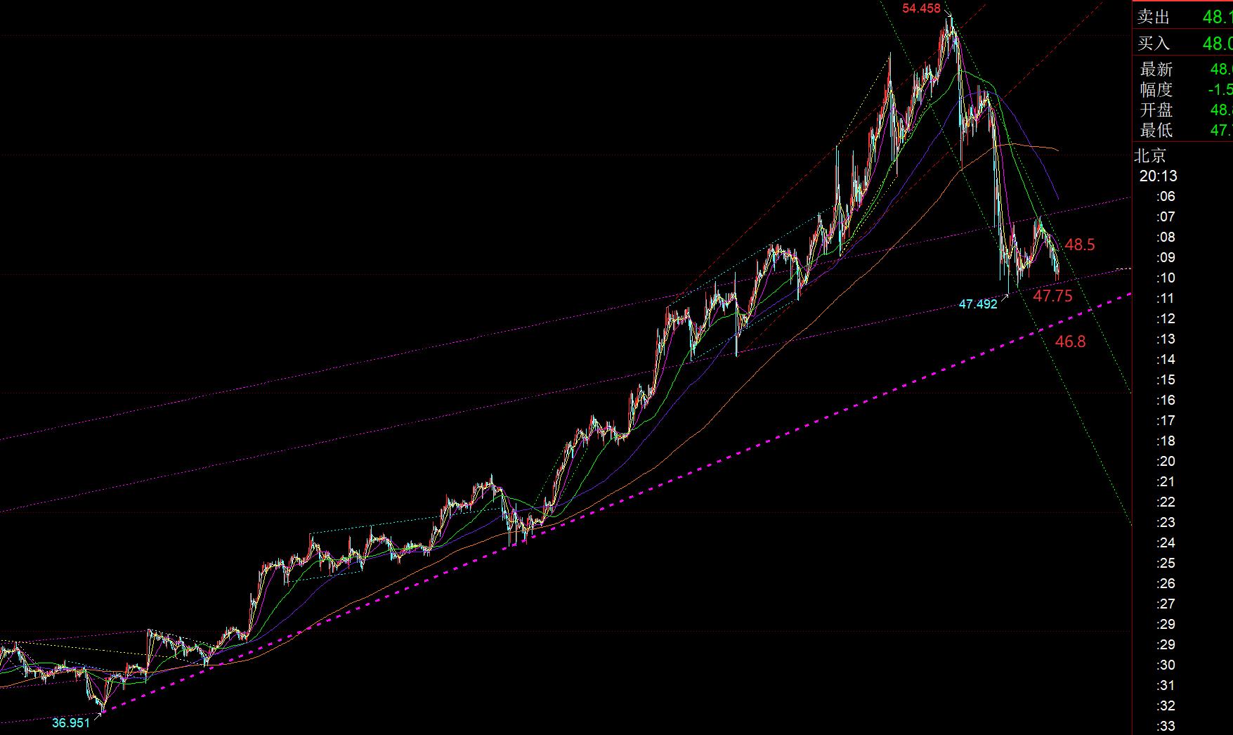 白銀方面:它的紫色生命趨勢線對應的衍生支撐點上移46.8-46.9一線;另外這幾日底部區間的下軌支撐是47.75一線,留意這兩處支撐的企穩信號;阻力48.5-48.8,同樣歐盤弱勢,先反彈阻力可嘗試看二次打壓下行,二次下滑仍企穩支撐則考慮逢低企穩反彈;若有效突破阻力,則上方看49.5;