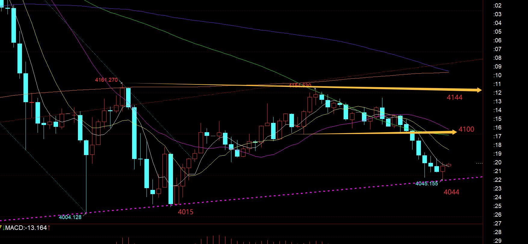 第三,黃金小時線級別:隔夜企穩4105反彈,今日早間再次下跌只4105上雙底反彈一波至4144,價格重新站上了66日關鍵均線,因為昨晚就是一路壓制此均線震盪下滑的;那麼陽線收盤突破站上它後,就以為守住4105,可以延續一波上行,結果橫盤整理幾個小時,午後下破4100引發一波下跌,最低打到了紫色趨勢線4044,並且得到了一定的反彈效果,說明這條3311一路支撐的線仍是有效的;但由於今日歐盤走弱,美盤前後反彈則可能誘多,還有二次打壓,所以今晚還需再次考驗它的得失生命力,若二次下滑依然穩住4044附近,則會繼續走底部區間反复,去4100的上方,乃至上軌4150-4160;反之,若收大陰或連陰收盤於4044之下,就要謹慎多,觀察它的延續下跌力度如何,下方還有4033、4025、4015、4004等幾個支撐;另外,美盤前後先反彈阻力留意4080和4100,承壓可看二次壓制下行;一旦重新站上4100之後,就謹慎空,觀察延續拉升力度如何,上方4144、4160-4180;