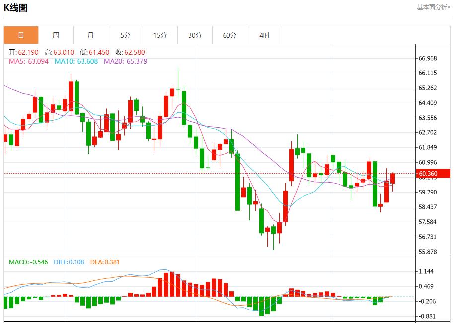 Crude oil market: As of 21:20 Beijing time, U.S. oil rose, currently trading at 60.340, an increase of 0.43%. Prices (crude oil) closed sharply higher in recent intraday trading in New York, supported by a positive signal from the relative strength indicator, with prices fluctuating around its 50-day exponential moving average while trading within a minor bearish channel in the near term, which reduces the chances of a full price recovery in the near term.