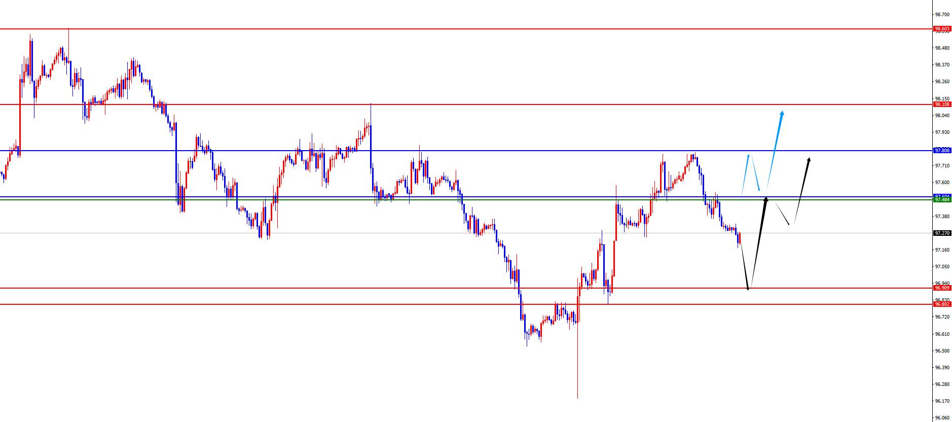 Da un'analisi multi-ciclo, il livello settimanale è stato recentemente un consolidamento chiave nella linea settimanale. Attualmente, la resistenza settimanale si trova nell'area 97.80. È importante prestare attenzione al fatto che questa posizione possa resistere questa settimana. Una volta che è fermo, i tori a medio termine continueranno. Dal livello giornaliero, con il passare del tempo, la linea giornaliera è attualmente supportata nell'area 97.50. Prenderemo attenzione a questa posizione per stabilizzare e aumentare ulteriormente. Dal punto di vista di quattro ore, la resistenza di quattro ore è attualmente in posizione 97.50, che risuona con la resistenza giornaliera. Poiché la direzione generale dell'indice statunitense è a basso livello e il fondo, prenderà attenzione a ulteriori aumenti una volta che si rompe. Premeremo temporaneamente l'attenzione al supporto della gamma 96.80-90 in un'ora e seguiremo i test per vedere ulteriori aumenti in questo settore. Se sei fermo in anticipo per quattro ore, concentrati sull'attacco in anticipo e tutti dovrebbero prestare attenzione al ritmo del mercato nel suo insieme.