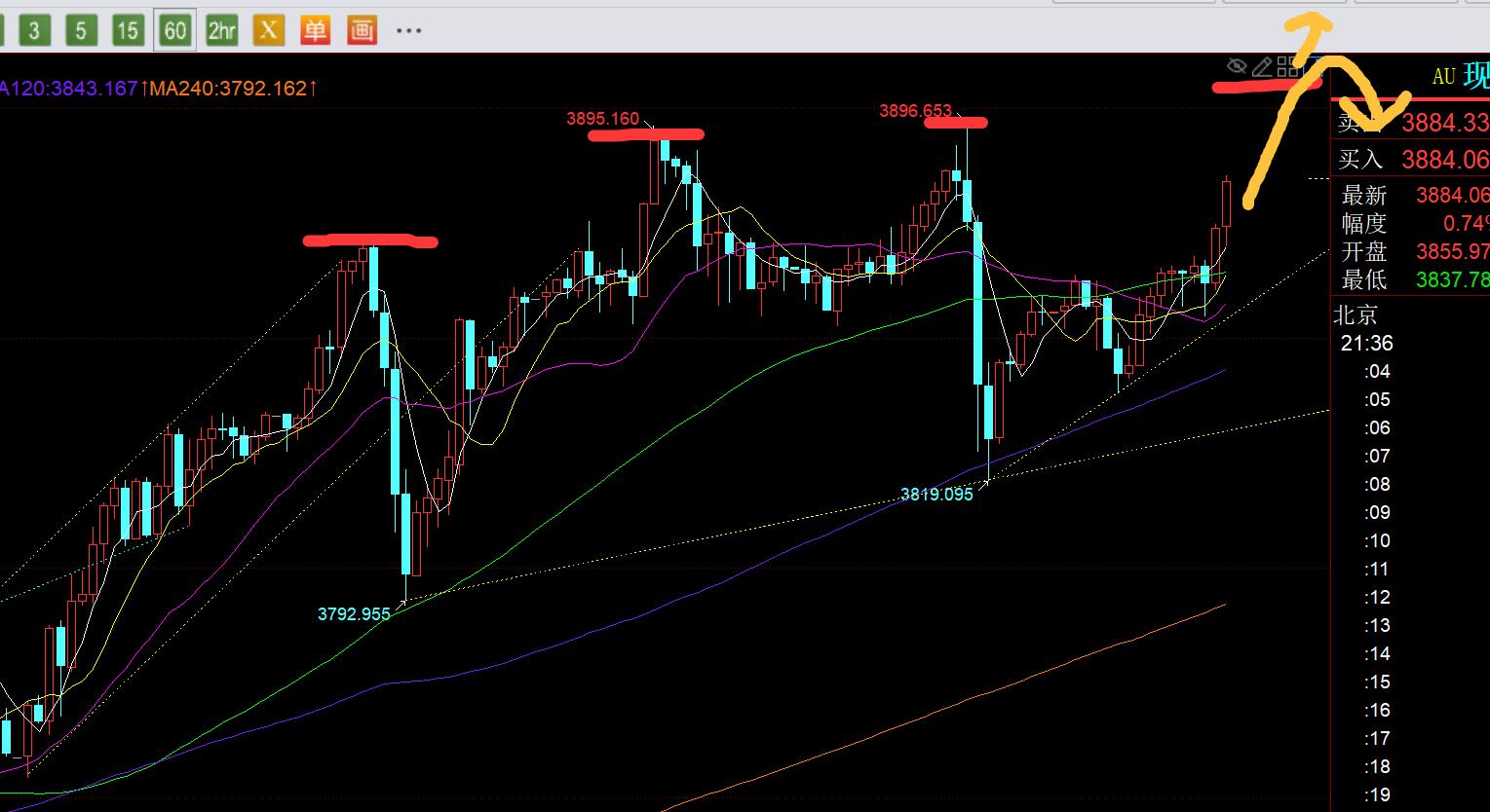 terzo, il livello di linea orario dorato: un leggero aumento del mattino e ha toccato il binario centrale e ha mostrato pressione. Quando la chiusura alle 9, il prezzo è tornato al di sotto di 3858 e quindi ha seguito decisamente un'ondata di declino ribassista. L'obiettivo finale era vicino a 3837, che era il supporto di 618 segmenti del rimbalzo notturno; Alle 14 del pomeriggio, un grande positivo ha testato di nuovo direttamente la pista centrale, inghiottendo il precedente K negativo, il che significa che il momento verso il basso è insufficiente. Sottolinea che una volta che il mercato si chiude di nuovo, deve seguire un'ondata di tendenza rialzista. Pertanto, quando appare la linea positiva a 15 punti, 3860 seguirà il rialzo e attualmente sta salendo a 3880; Successivamente, vediamo se le routine di uccisioni lunghe e brevi della scorsa notte appariranno stasera, premendo a corto di perforare il punto più alto di ieri, e poi di retrocedere rapidamente e sopprimere. Pertanto, dopo 3897 pause, è necessario prestare molta attenzione al fatto che vi sia una rapida azione di pressione. Il motivo è un lungo ombra superiore K, preferibilmente una linea negativa, quindi devi fare attenzione a cadere sotto pressione; currently maintaining short squeeze and pull up, and be cautious about rising above resistance 3897. If it does not experience a circular pressure plunge, but maintains a continuous positive rise, then you must basically stand firm at 3900 at the beginning of next week and further make a strong unilateral force, and then continue to rise strongly;