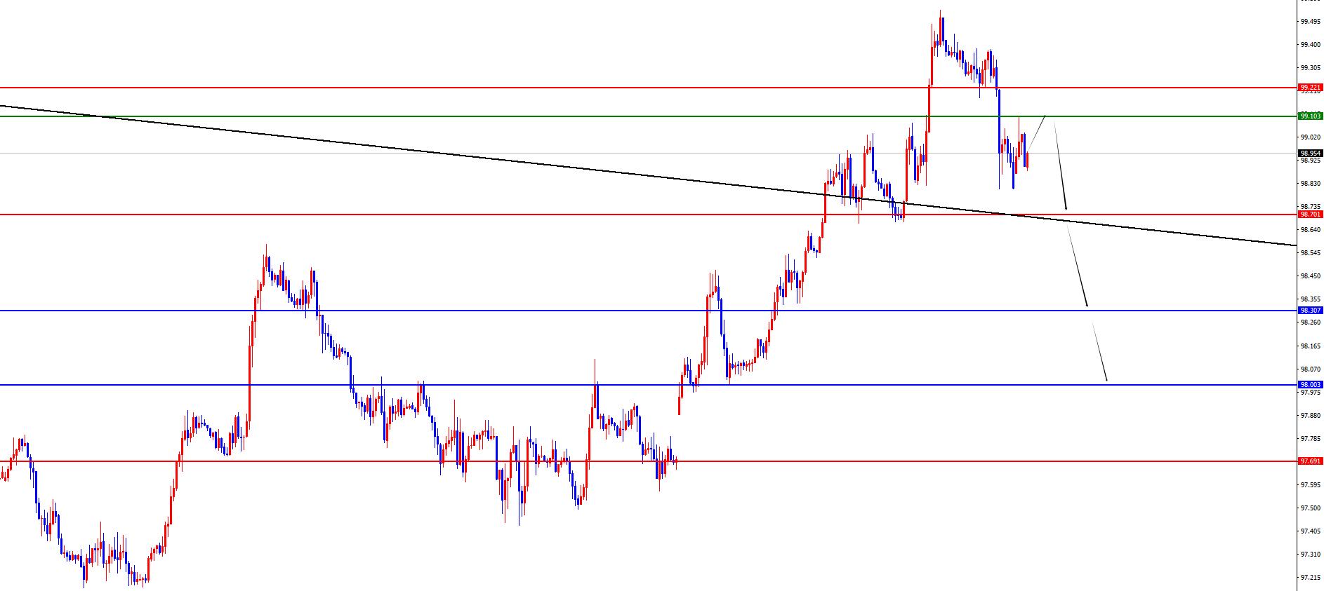 Da un'analisi multiciclo, il prezzo settimanale si è stabilizzato la scorsa settimana dopo aver continuato a fluttuare nella fase iniziale. L'attuale supporto settimanale è nell'area 98, e l'attenzione sarà rivolta ad ulteriori rialzisti di medio termine. Dal livello giornaliero, col passare del tempo, l'attuale supporto giornaliero è nell'area 98,30 e la fascia di prezzo al di sopra di questa posizione aumenterà ulteriormente. Da una prospettiva di quattro ore, quando venerdì scorso il prezzo è sceso al di sotto del supporto di quattro ore, era sotto pressione a breve termine. Allo stesso tempo, dobbiamo prestare attenzione al gap della scorsa settimana. L'attuale resistenza di quattro ore è nell'intervallo 99,10-20. Al di sotto di questa posizione, il prezzo guarderà prima alla pressione. Di seguito, concentrati sulle aree 98.70-98.30 e sul supporto settimanale 98. L'attuale pressione sui prezzi non è ancora terminata. Nel breve termine, ci concentreremo su ulteriori pressioni.