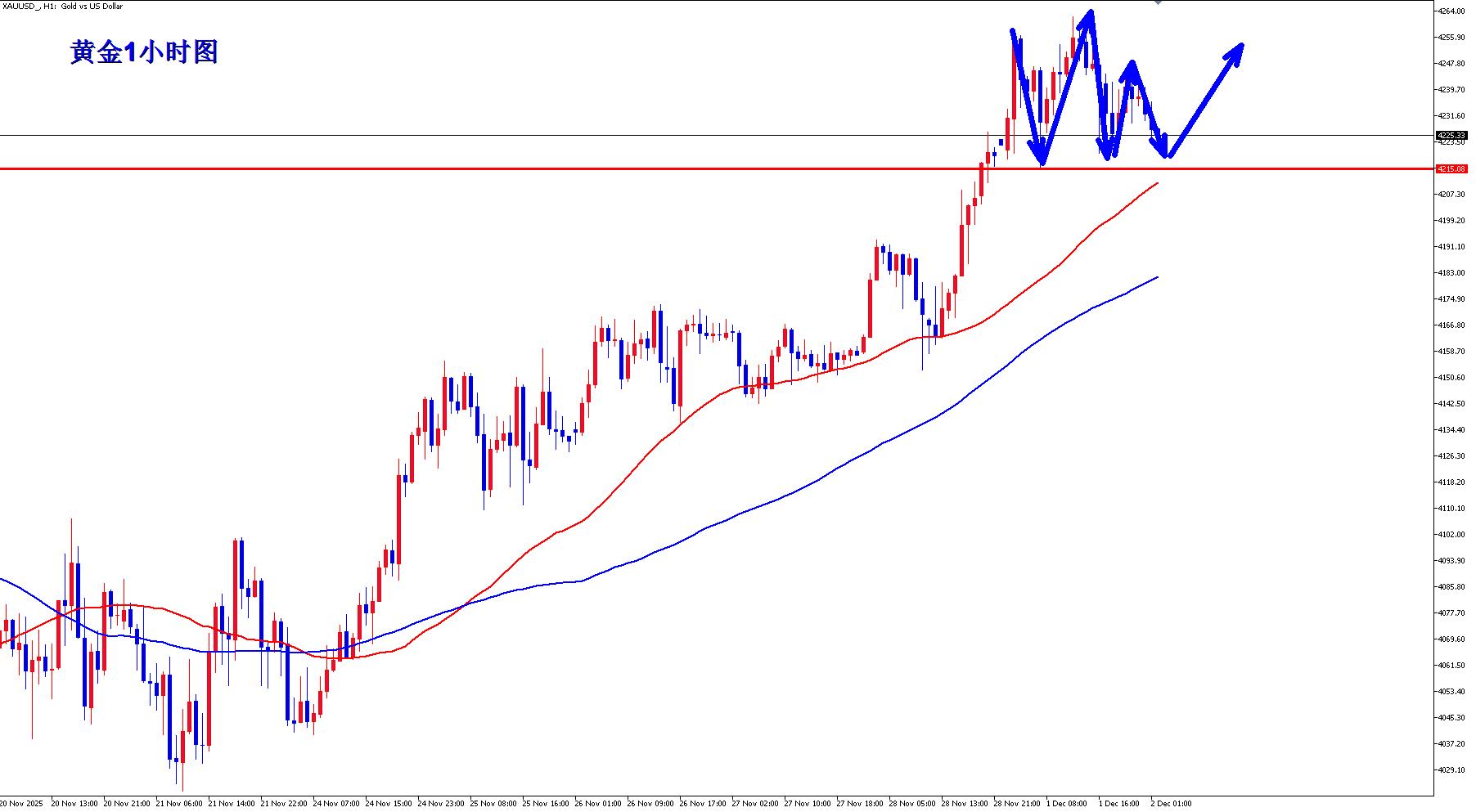 黄金1小时均线还是进行金叉向上的多头排列发散,黄金多头上涨还有力度,黄金1小时现在整体是震荡,那么黄金的震荡下沿支撑在4215-4220区域,那么早盘还是在此区域逢低顺势做多,黄金多头还有向上的动能。