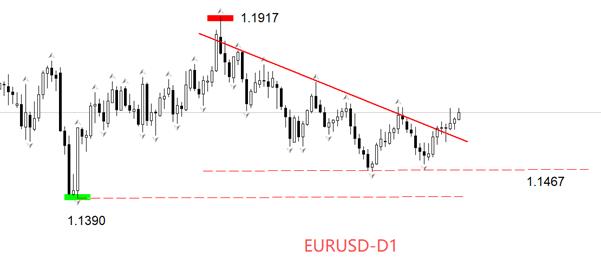 技术角度看,日线级别,EURUSD处于高位横盘震荡状态,震荡上限在1.1917点,下限在1.1390点。11月26日的阳K线,与图中的下降趋势线交叉,反弹走势有加速迹象。截至目前,已经有连续五根K线的收盘价处于下降趋势线上方,形成有效突破结构。考虑到EURUSD在前一轮走势中保持震荡区间内顶部到底部的运行,本次反弹走势可能遵循底部到顶部的震荡区间运行,中期目标或在前期高点1.1917附近。